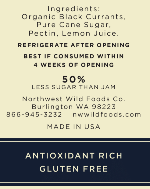 Ingredients: Organic Black Currants, Pure Cane Sugar, Fruit Pectin, Lemon Juice