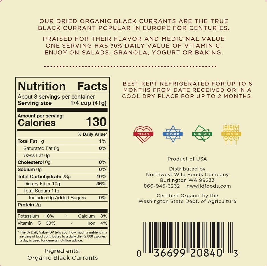 Dried organic black currants (Ribes nigrum) are dried naturally without any added sugars or oils. They are 100% pure fruit and all natural with no additives. Each currant is low-heat dried to perfection in small batches which helps maintain their wonderful aroma, flavor and very importantly their exceptional nutritional value. Black currants have the highest Vitamin C content of any berries. A few tablespoons of dried organic black currants are over 100% the recommended daily value. Black currants are an extremely popular berry throughout Europe where they are renowned for their delicious tangy flavor. They are also extremely beneficial for eye health. Repeat customers who use this product regularly have seen a reduction in the effects of glaucoma, cataracts, retinal detachments and more. Enjoy our dried black currants today!