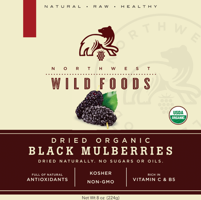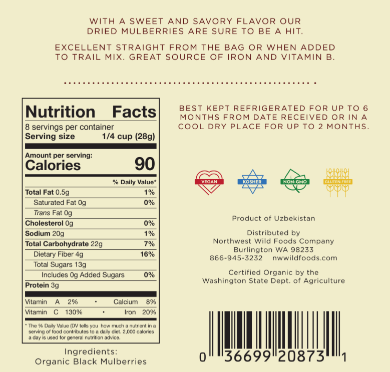 Dried organic black mulberries make a great snack straight from the bag or when added in fruit salads or trail mixes. Black mulberries are much more flavorful than their white counterparts with a mildly tangy flavor that is very delicious. Mulberries have been eaten for hundreds of years throughout Europe and Asia, where they are popular in jams, syrups, pies, etc. Fresh off the bush they look very similar to a blackberry. Our dried organic black mulberries are grown organically in Uzbekistan and dried to perfection without any sugars or oils added. They are 100% fruit and all natural. Mulberries grow on large, deciduous trees native to warm, temperate, and subtropical regions of Asia, Africa, and the Americas. Technically, the mulberry fruit is an aggregation of small fruits. Black mulberries, in particular, are more flavorful and tasty than their fellow white, and red varieties.