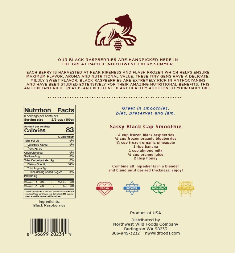 Our fresh frozen black raspberries are harvested in the Northwest each summer and flash frozen at peak ripeness. Related to the more common red raspberry, black raspberries have a softer, sweet and mild flavor. Black raspberries are very popular for smoothies, pies, jams or by the handful out of the bag. Black raspberries are known to be high in anthocyanins, powerful antioxidants that provide exceptional nutritional value that may help ward of certain cancers. They are also being studied extensively for their health benefits for things like cancer prevention as well as lowering the risk of other diseases. Preliminary studies show black raspberries are amazing at fighting cancerous tumors in the body. Our fresh frozen black raspberries are extremely delicate so they may crumble slightly but they are delicious and healthy berries. Whether you enjoy black raspberries for their great nutritional values or love their delicious flavor, you can now buy fresh frozen black raspberries online and have them shipped to the door.