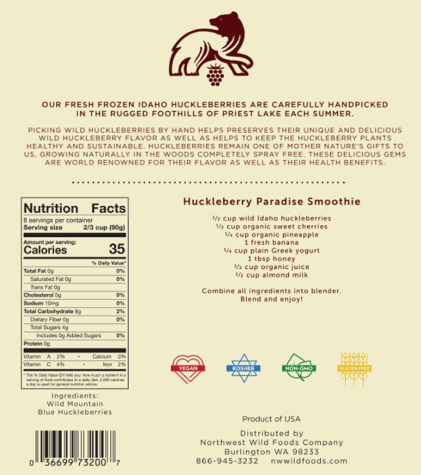 Our fresh frozen Idaho huckleberries are carefully hand picked in the rugged foothills of Idaho each summer. Picking wild huckleberries by hand helps to preserve their unique and delicious wild huckleberry flavor. As seasoned pickers know, wild huckleberries are very difficult to pick. Our huckleberries are flash frozen straight after they are picked to lock in the wonderful flavor and to maintain maximum antioxidant levels in these delicious treasures. Wild huckleberries are not certified organic but we consider all wild berries to be better than organic. They are truly a treat, grown by mother nature without any sprays at all. Wild berries are typically four to eight times greater in antioxidants than farmed berries making them true super fruits. Huckleberries have been used by Native Americans for hundreds of years as natural medicine. Try our delicious fresh frozen Idaho huckleberries today. Huckleberries truly are the best of the wild. Product of the USA.