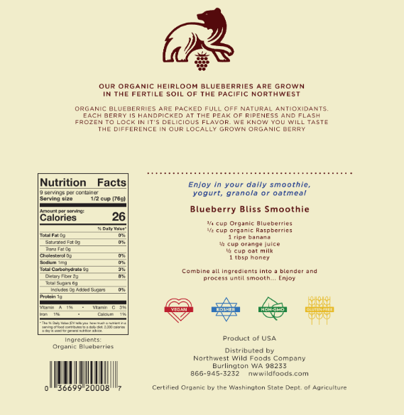 - Raw freshly frozen organic blueberries- Grown in Washington State