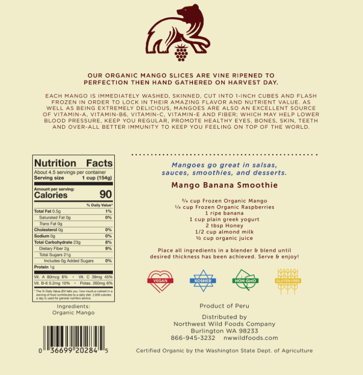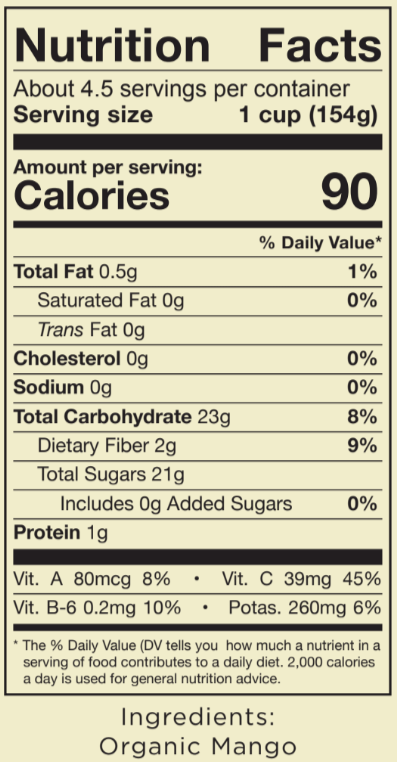 Our fresh frozen organic mango chunks make a delicious and healthy addition to your daily diet. Mangoes grow on large trees in tropical climates around the world but like anything not all are created equal. Our fresh frozen organic mango chunks are selected from only the most flavorful, best tasting variety of mango in the world. These delicious gems are sun ripened to perfection, cut into delicious cubes and individually quick frozen to lock in their amazing flavor and powerful nutrient value. We love fresh mango, but when not in season our fresh frozen organic mango chunks are an excellent alternative. Eating mango can’t get any easier than we have made it. We suggest pairing the mango with our wild mountain blackberries or organic raspberries for a simple, delicious smoothie. Try our delicious sun ripened organic mango today. Shipped frozen straight to your door for maximum enjoyment!