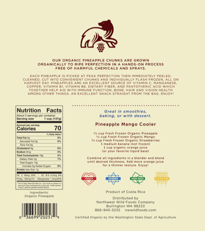 Our fresh frozen organic pineapples are hand picked at peak ripeness; then skinned, cleaned, cut into chunks and frozen on harvest day to lock in their tantalizing sweet flavor and nutritional goodness. Our Fresh Frozen Organic Pineapple is grown sustainably in Costa Rica without the use of dangerous pesticide or chemical sprays that can seep into the fruit as well as the environment. so you can enjoy our pineapple chunks with a clear conscience! As well as being grown sustainably and organically, our fresh frozen organic pineapple Chunks are an excellent source of vitamin C, manganese, copper, vitamin B1, vitamin B6, dietary fiber, folate, and pantothenic acid; which help aid with immune function, bone, hair and vision health among other things. Historically, in North America, Europe and the Caribbean the pineapple became associated with ships returning from long voyages and hence became an emblem of welcome and hospitality. So the next time you have a gathering of family and loved ones be sure to serve up some pineapple with all that love!