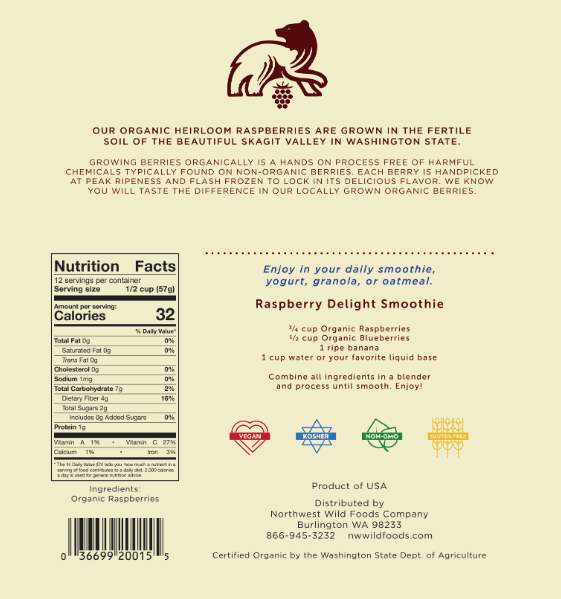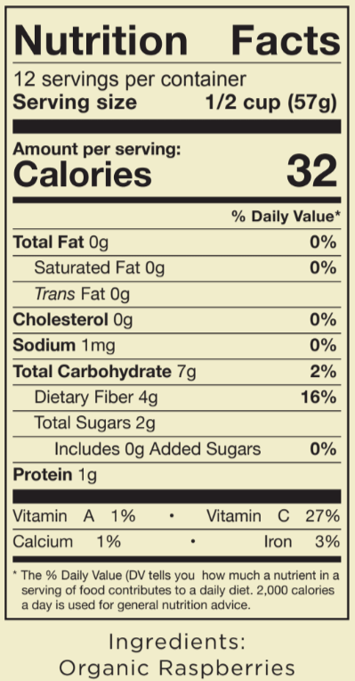 Ingredients: Fresh Frozen Organic Raspberries- Grown in Washington State