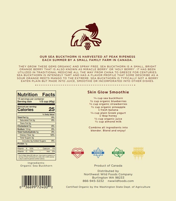 The organic sea buckthorn is a small, bright orange berry that is also known as ‘miracle berry’ or ‘holy berry’. It has been utilized in traditional medicine all the way from China to Greece for centuries. Ancient Greeks discovered its wide array of health benefits when war horses were retired (set free to roam their last days in the wild) the ones who went to the wild sea buckthorn bushes would return re-energized and healthy with a glossy coat. When the Chernobyl disaster struck, Sea Buckthorn was used to help treat the burn victims. Wild sea buckthorn is very tart and has a flavor profile that some describe as sour orange meets mango. With protein building amino acids, Vitamins B1, B2, K, C, A, E, folic acid, healthy fatty acids, at least 60 antioxidants and 20 minerals among other beneficial compounds, sea buckthorn is a true super food. Organic sea buckthorn is an impressively healthy addition to your daily diet. Shipped frozen straight to your door. Enjoy!