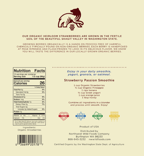 Our delicious fresh frozen organic heirloom strawberries are grown right here in the beautiful Skagit Valley in Washington State. Our lush and fertile soil makes our strawberries much tastier than California berries. Trust us, you will smell and taste the difference. Ours won’t be as perfect and pretty (because ours are not full of chemicals) but they will be much tastier and healthier. The organic strawberries are hand harvested, then same day individually quick frozen in order to lock in their wonderful aroma, nutritional and flavor. This also means that you can conveniently pour out how many you want, then re seal the bag and pop it back in the freezer for future use. Did you know that conventionally grown strawberries are one of the top 5 most heavily sprayed fruits? More reason to eat pesticide free organic strawberries!! Fresh strawberries actually lose essential nutrients as they sit on the store shelf, whereas ours are frozen the same day they are picked locking in those essential nutrients. Our fresh frozen organic strawberries are very versatile and keep well in the freezer. Try our freshly frozen organic heirloom strawberries today and have them conveniently shipped frozen straight to your door. Enjoy!