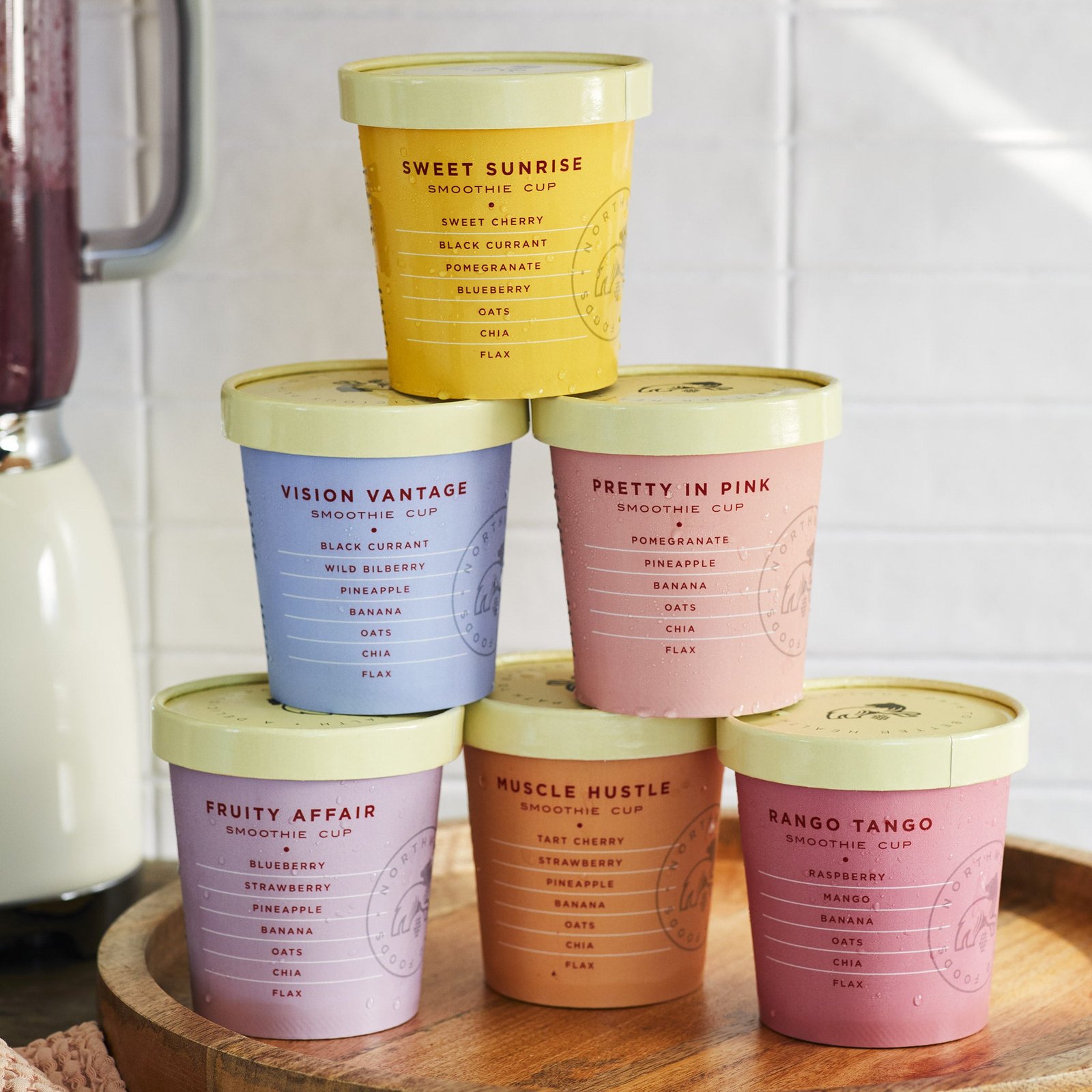 Our specially formulated smoothie cups are designed for flavor, health benefits and ease of use in mind. Simply remove the lid, fill your cup to the brim with your favorite liquid base (we love almond milk, orange juice, or both), then pour into your blender and blend until desired thickness. Pour the contents of the blender back into your cup and replace the lid for the perfect on the go snack. Delivered straight to your door. Enjoy!