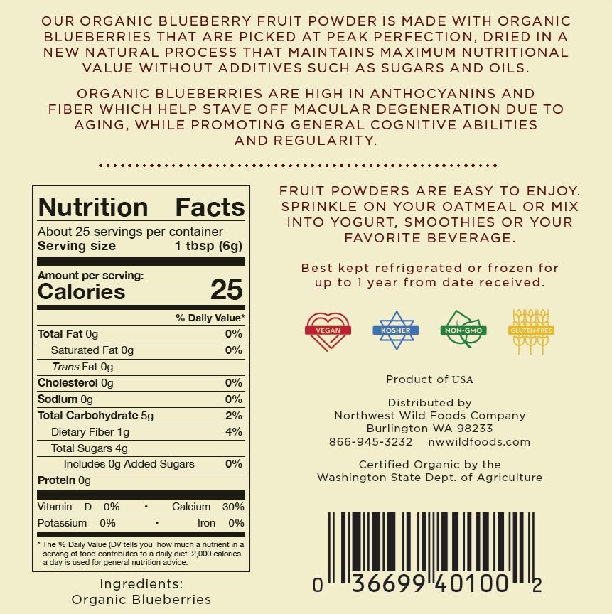 Blueberries have been a top favorite of American families for generations. It goes without saying, they are a delicious treat. As well as being a scrumptious morsel, they are also very good for your health. Our organic blueberry fruit powder is made with ripened to perfection, USA grown, organic, and sustainably harvested blueberries which are carefully hand gathered. The organic blueberries are then flash frozen within hours, which locks in the key antioxidant properties of the fruit. The flash frozen fruit is then dried with a new, low impact method of dehydration in small batches that maintains low temperatures and maximum nutritional values of the fruit. Our powders maintain higher levels of antioxidants, polyphenols, flavor, color and a better taste than other powders. Some blueberry powders are processed via a ‘spray freeze’ method which involves heating the the berries to very high temperatures. This kills all the active properties in the berries, rendering them near, if not completely useless. Blueberries are well know for for their powerful antioxidant properties which are extremely beneficial to maintaining a healthy mind, body and soul. Some of the benefits include anti-aging, anti-bacterial, and pro cognitive health. Eating blueberries regularly in your diet may aid in brain and memory health, while helping stave off the effects Alzheimer’s.