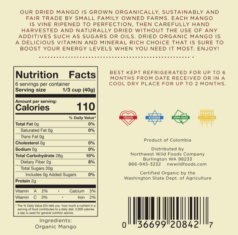 Dried organic mango is grown organically and sustainably. Each mango is vine ripened to perfection, then carefully hand harvested and naturally dried right away, without the use of any additives such as sugars or oils. Mango has a delicious mild yet sweet flavor that has been popular around the world for many years now. Our dried organic mango goes especially well in cereal, oatmeal and granola, or is also a tasty and healthy snack straight out of the bag. Mango is nature’s answer to candy, and there is no wrong way to eat it. Feeling low in energy? Need a quick ‘pick me up’ to get through the day? Take the choice that is healthy, flavorful and sure to give you that much needed energy boost to help you make it through the day. Don’t delay, get your dried organic mango today!