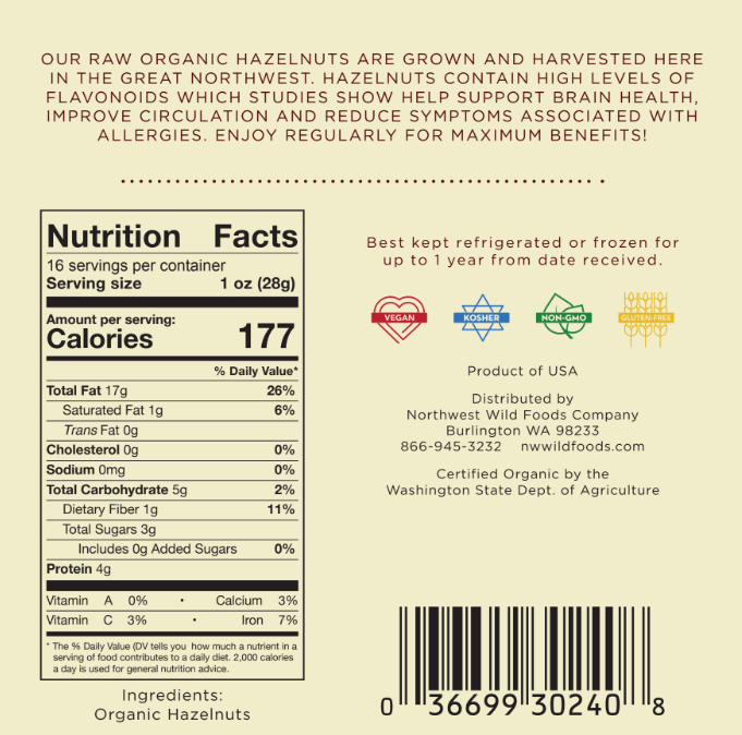 Our raw organic hazelnuts are of the Jefferson variety and are grown carefully without the use of harmful chemicals or sprays right here in the great Northwest. The unique texture and marvelous flavor of hazelnuts make them a favorite of chefs, bakers, food manufacturers, and cooks around the globe. Raw organic hazelnuts are a sweet flavored nut best enjoyed in baked recipes, salads, trail mixes or simply eaten raw as a healthy snack. We hand select only the finest whole hazelnuts, shell them and air dry to delicious perfection. Roasted nuts lose some of their nutritional value in the roasting process, therefore eating the organic hazelnuts raw guarantees getting the total nutritional value possible. Hazelnuts contain high levels of flavonoids. Studies show flavonoids may help support brain health, improve circulation and reduce symptoms associated with allergies. Simply eating a handful of hazelnuts for a snack daily may provide your body with all these healthy benefits.