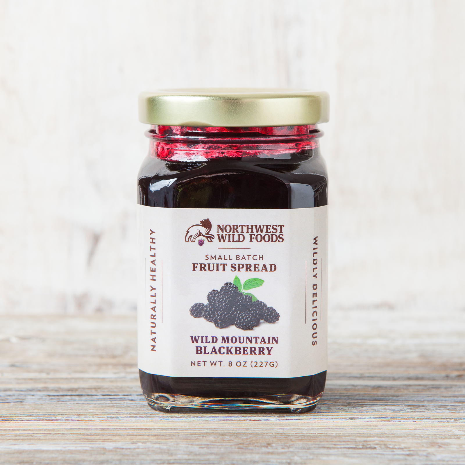 Wild mountain blackberry fruit spread is made exclusively from little, wild mountain blackberries. The tart, intense flavor and small size of this little native berry makes it the perfect fruit for classic Northwest treat. Once you have tasted this treasure of the wild, we believe you’ll agree with Northwest berry lovers who consider wild mountain blackberries the uncrowned king of all berries. This jam is an excellent balance of sweet and tart flavors both. It does have seeds however they are very minimal in size unlike a farmed blackberry.